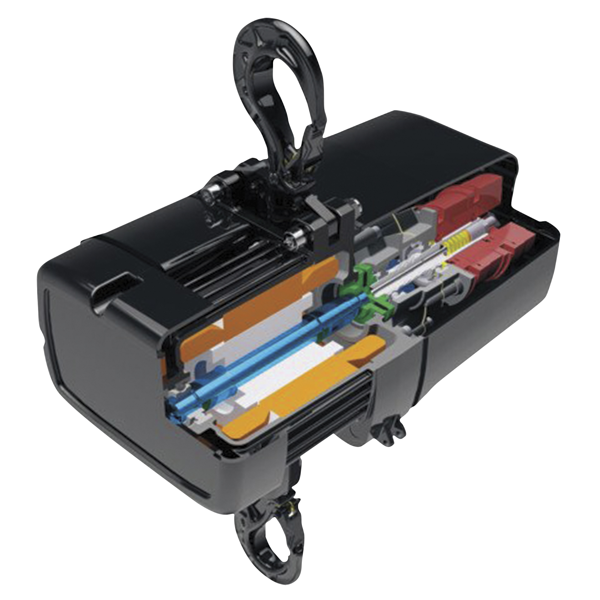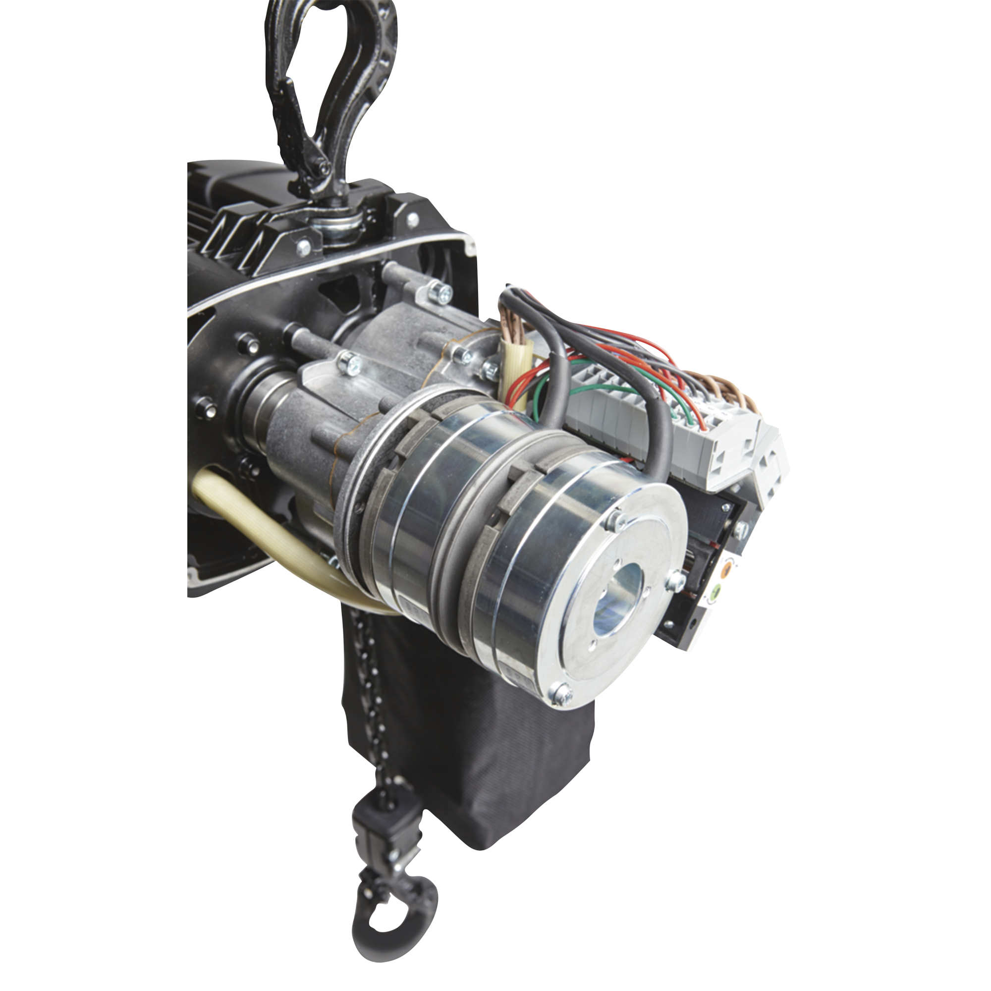 Two independent brake systems and a safety factor 8:1 allow people to stand under the load without a secondary safety device. By means of direct control, the chain hoists can be easily combined as group hoists. The chain hoist is in accordance with BGV D8+ as a modular chain hoist for lifting loads. The lifting capacity is 0.5t in a single reeved chain hoist. The chain hoists are perfectly suitable for both mobile and outdoor use. The top and bottom end positions can be individually and precisely set. The optional locking load hook prevents the load from accidentally slipping off the load hook.